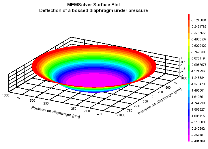 The plot shows the deflection of the bossed diaphragm under pressure. The X axis gives the position from the center towards the outer perimeter for the top fiber of the diaphragm. The deflection flattens off where the boss starts. Using the cross hair tool, the defection at any distance from the center can be calculated.