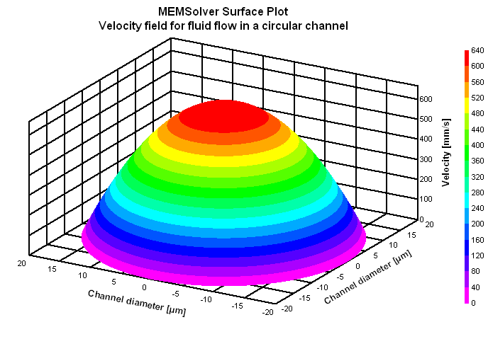 The plot shows the velocity field for the Poiseuille flow in a circular channel. It shows the magnitude of velocity at every point on a line along the diameter. The maximum velocity can be found out from the velocity field plot which happens at the center of the channel. The channel diameter cannot be smaller than a minimum value as it will lead to blocking of the channel by air bubbles. That depends on the surface tension of the fluid and the applied pressure.