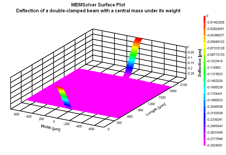 The X-Y plot gives the distribution of stress on the beam surface. It shows that the stress changes from positive maximum to negative maximum along the length of the beam. When the mass is pushed down, the surface stress near the clamped edge will be tensile and that near the mass will be compressive. he 2D and 3D surface plots shows the deflection of the beam mass system.